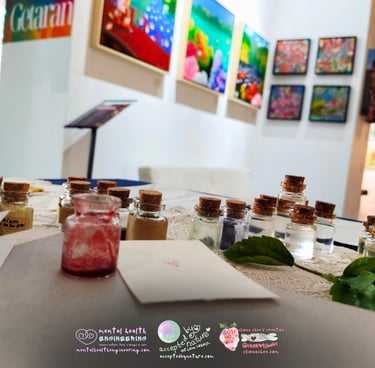 For the law of conservation of energy in thermodynamics let us understand that energy transform into different forms, not created nor destroyed. So, in arts, we can reimagine and visualise how our energy is flowing and connecting nature, neuro, and back to our Souls. Meanwhile, we are actually physically seeing, touching, and using our senses as well as the unexplored senses to experiment with the natural colour pigments we love. Full of expression and love.