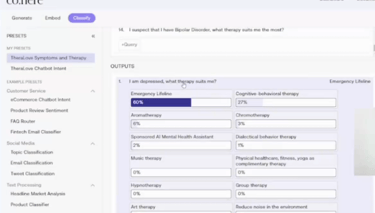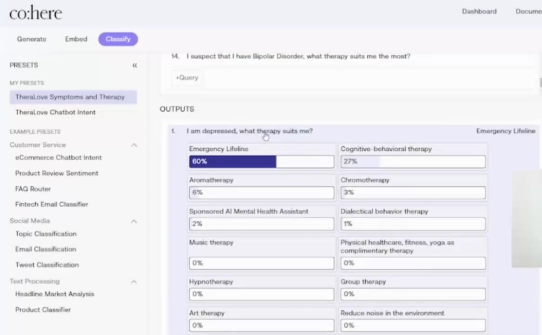 Matching effective mental health therapy that suits you the most, precisely using Cohere Classify artificial intelligence tool. According to TheraLove Bot's assessment of the lovely kind soul's personality, preferences, and current state of mind, TheraLove recommends the suitable mental health therapies.