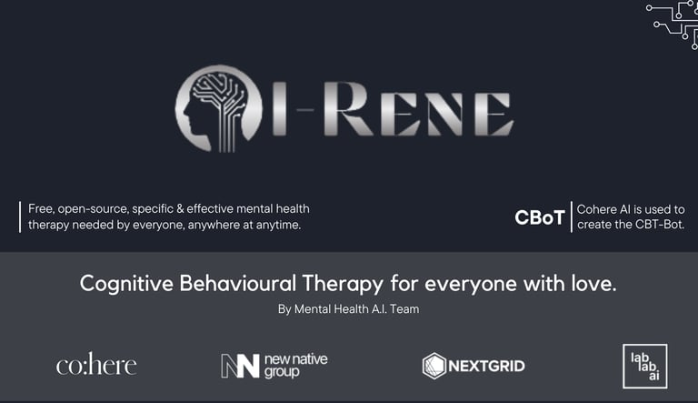 Generative AI Hackathon awards Second Prize to I-Rene, our humble AI CBT chatbot. The prototype provided context-dependent answers that are tailored to the individual needs of our users. The approach is based on the principles of cognitive-behavioral therapy (CBT), which is a proven effective treatment for a variety of mental health concerns. By minting non-fungible tokens (NFTs) for each individual user, the prototype provided a transparent and verifiable record of our users' progress, further enhancing the effectiveness of our platform. The integration of Web 3's approach to allow users have more control over their data separates I-Rene from the other chatbots.